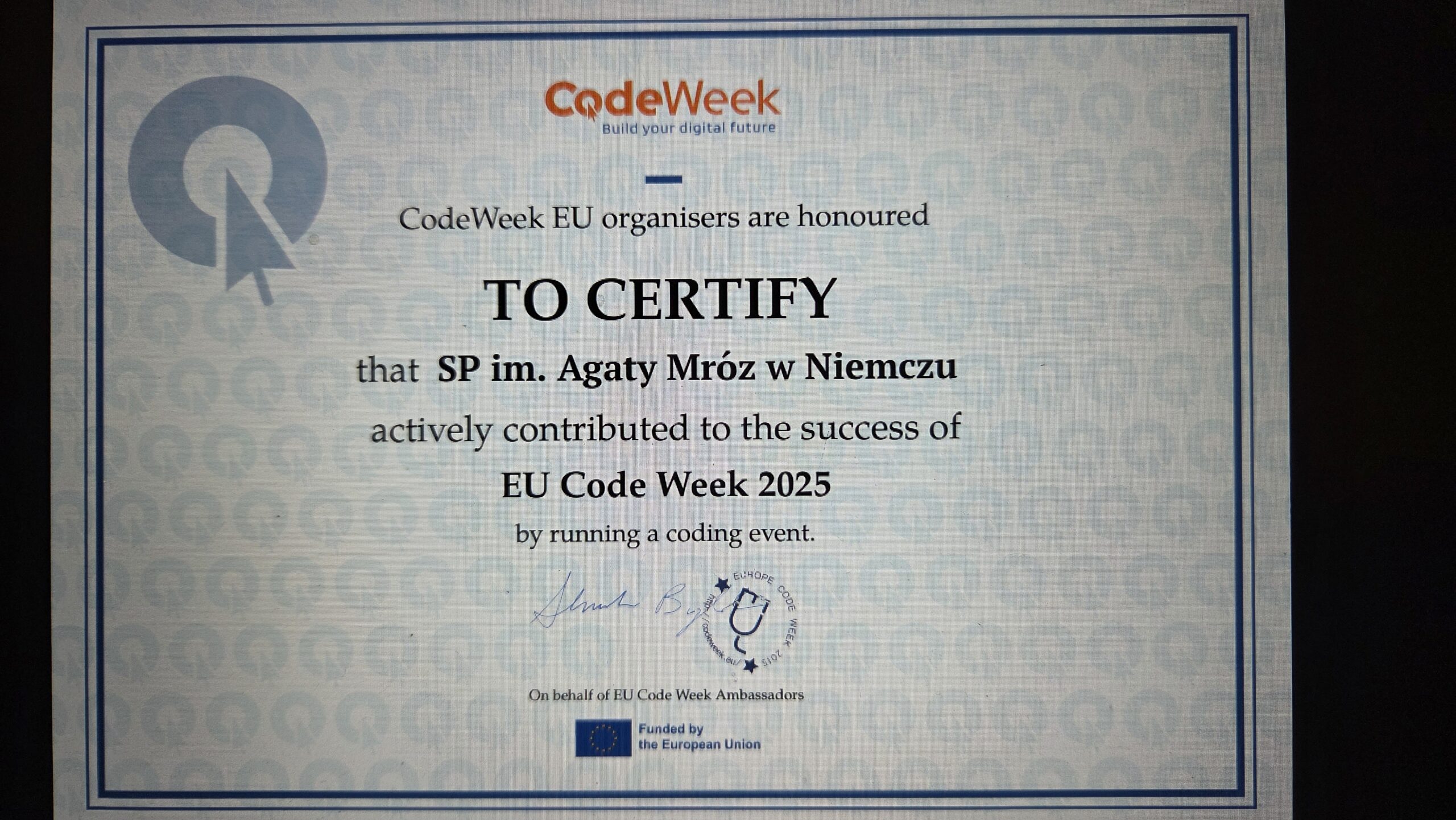 Na zajęciach informatyki z wielkim zaangażowaniem budowali i programowali ciekawe modele z edukacyjnych klocków LEGO Spike Prime i Essential. Dzięki Wam i Waszym inicjatywom promującym edukację cyfrową zdobyliście oficjalny certyfikat potwierdzający udział w codeweekowym wydarzeniu. Serdecznie gratuluję.